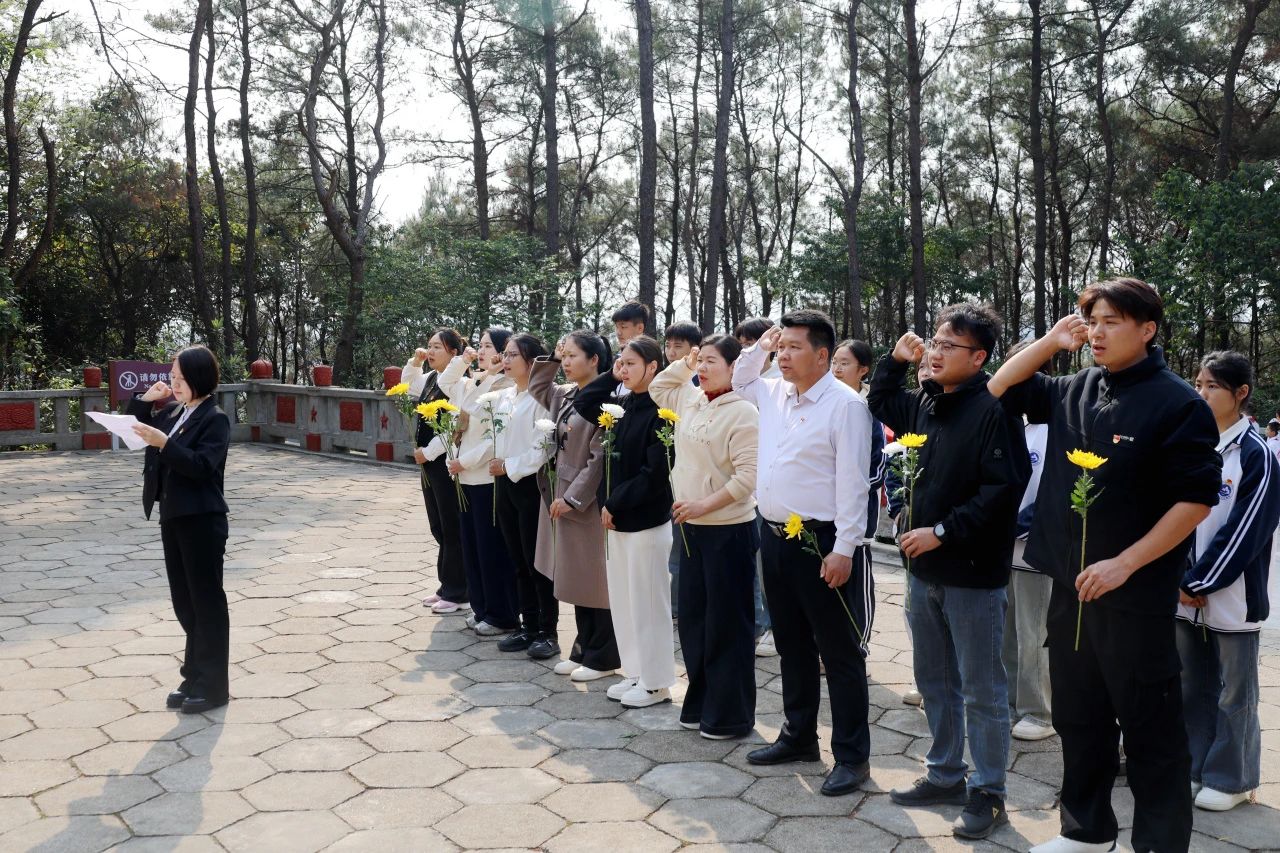 活动由党支部书记张毅主持。青山巍巍,松柏苍翠,两名学生代表迈着坚定而又沉重的步伐,缓缓走向纪念碑,向先烈敬献花圈。朵朵白菊寄托哀思,全体师生肃立凝视,以无声的注目礼传递对英雄的深切怀念与崇高敬意。