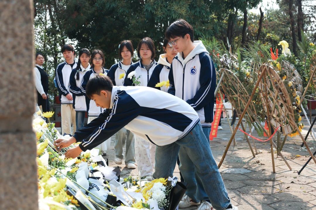 仪式最后,师生们手持白菊缓步绕行纪念碑。每一朵轻轻安放的鲜花,都是对先烈精神的无声传承;每一个深深凝望的眼神,都在续写着红色基因的时代注脚。当阳光穿透云层洒满纪念碑时,浮雕上的英雄群像仿佛被赋予了新的生命光彩。
